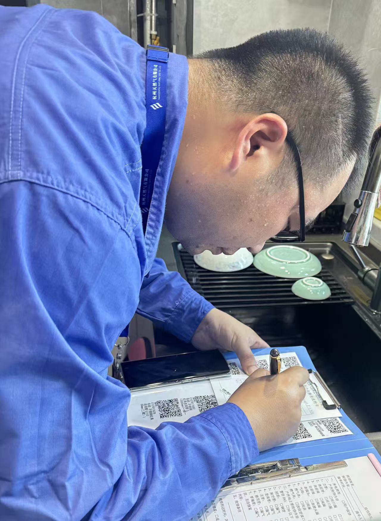 傅建飛一邊向聞女士耐心解釋,一邊熟練地關(guān)閉燃氣總閥、拆卸舊表。盡管室內(nèi)開著空調(diào),但他動作精準又迅速,不一會兒額頭便滲出細密汗珠,工裝后背也漸漸被汗水浸濕。安裝新表后,他反復(fù)用檢測儀檢測接口處,確認無泄漏后,又手把手教聞女士如何查看新表讀數(shù)、更換電池、識別異常情況等。傅建飛表示,正常情況下,新?lián)Q上的NB-IoT智能燃氣表電池可使用1-2年,如遇電池需要更換的情況,可將下方電池蓋打開,換上4節(jié)新的5號電池。完成后蓋上蓋子,再按一下紅色按鈕,等數(shù)據(jù)恢復(fù)后即可正常使用。